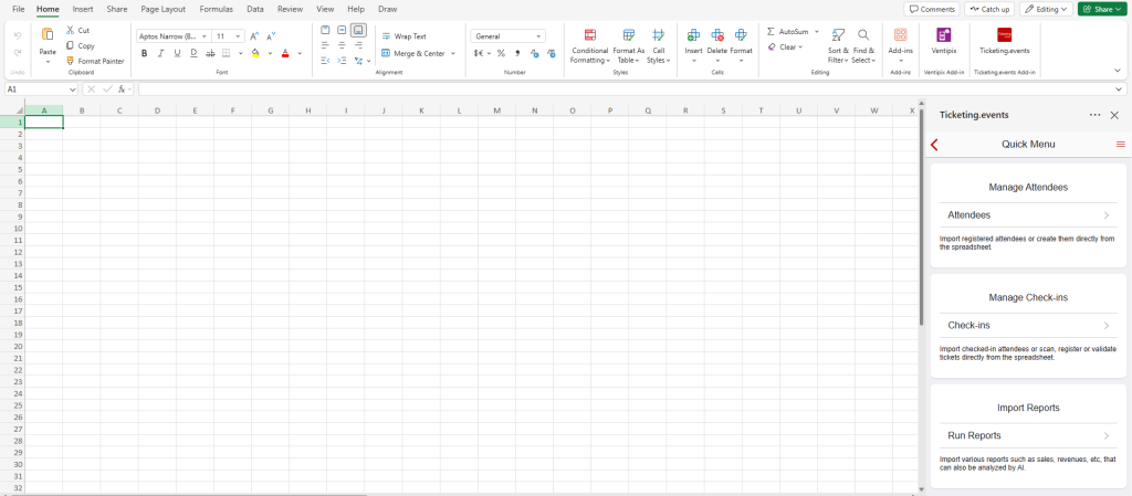 With our task pane, you can interact with and manage event data, including attendees, check-ins, ticket validation, and report generation.